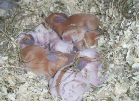 Now at 22 days old, they are much more active, starting to come out of the nest and nibble at hay and green food. Most weigh 9 to 10 ounces. This is my favourite age, they are so cute and fluffy!